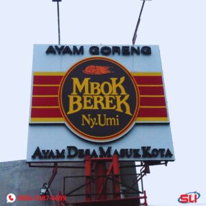 Desain bentuknya menyesuaikan dengan keinginan Anda. Kebanyakan orang membuat seperti logo usaha mereka. Penerangan menggunakan LED sehingga lebih hemat listrik.